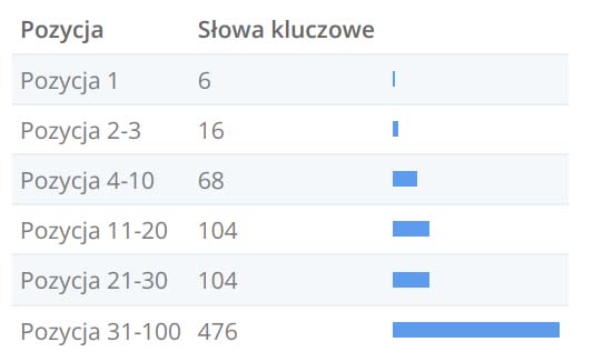Podsumowanie pozycji dla rankingów słów kluczowych strony www.btsenior.pl. Im wyższy ranking, tym większe prawdopodobieństwo na skorzystanie z ruchu, przy czym najnowsze badania pokazują, że nawet 92% kliknięć ma miejsce na pierwszej stronie.
