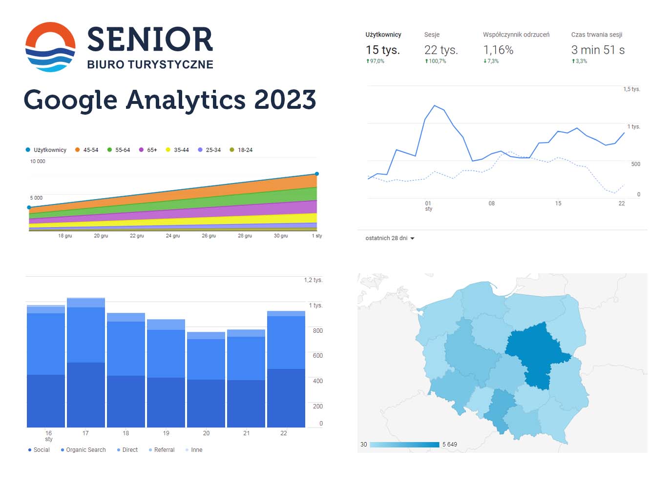 Strona www.btsenior.pl jest nieustannie rozwijana oraz optymalizowana. Na bieżąco prowadzimy działania marketingowe i reklamowe mające na celu docieranie do jak największej grupy odbiorców. Dbamy o wysoką pozycję w wyszukiwarkach oraz w social mediach, gdzie także prowadzimy kampanie reklamowe. Poniżej przedstawiamy bieżący raport statystyk Google Analytics.
